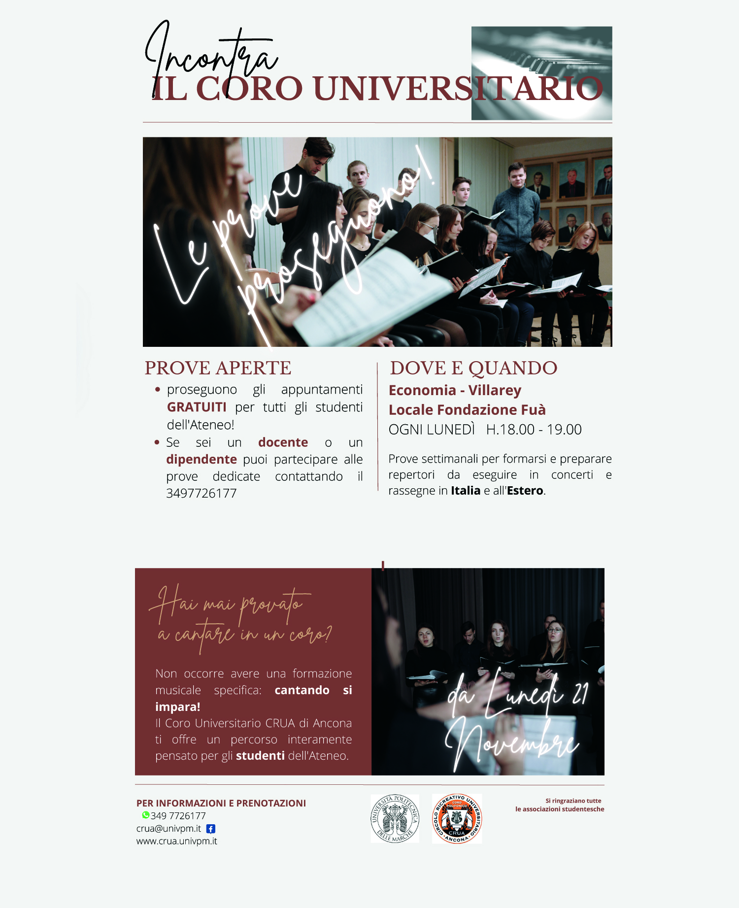 Ogni lunedì H. 18.00 – 19.00 puoi incontrare il Coro Universitario per preparare un repertorio da eseguire in concerti e rassegne.